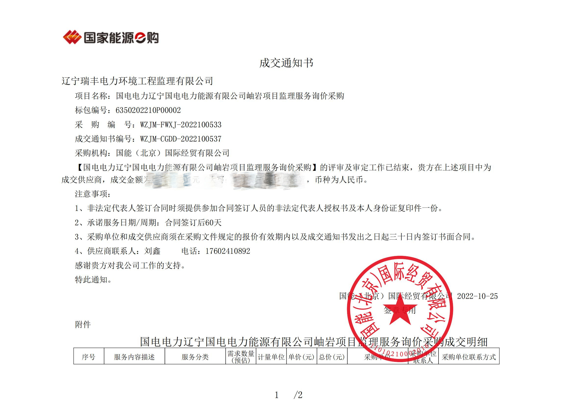 遼寧瑞豐電力環境工程監理有限公司于2022年10月20日與鞍山國電電力新能源有限公司簽訂了《國電電力遼寧岫巖整縣光伏發電一期農光、漁光互補項目》監理合同。